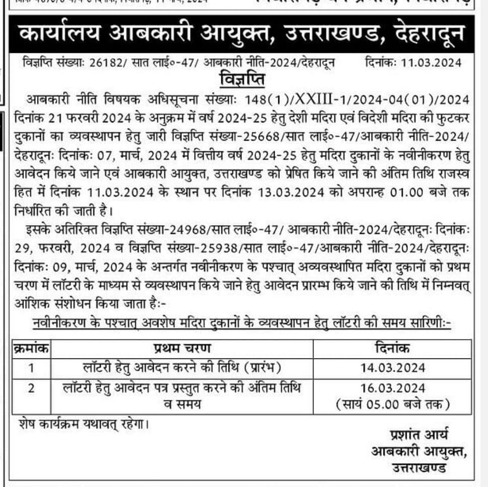 आबकारी नीति विषयक अधिसूचना संख्याः 148 (1)/XXIII-1/2024-04(01)/2024 दिनांक 21 फरवरी 2024 के अनुक्रम में वर्ष 2024-25 हेतु देशी मदिरा एवं विदेशी मदिरा की फुटकर दुकानों का व्यवस्थापन हेतु जारी विज्ञप्ति संख्या-25668/सात लाई०-47/आबकारी नीति-2024/ देहरादूनः दिनांकः 07, मार्च, 2024 में वित्तीय वर्ष 2024-25 हेतु मदिरा दुकानों के नवीनीकरण हेतु आवेदन किये जाने एवं आबकारी आयुक्त, उत्तराखण्ड को प्रेषित किये जाने की अंतिम तिथि राजस्व हित में दिनांक 11.03.2024 के स्थान पर दिनांक 13.03.2024 को अपरान्ह 01.00 बजे तक निर्धारित की जाती है।